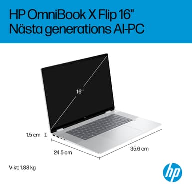 HP OmniBook X Flip 16 Ultra 7-256V/16/1TB/OLED 16" Copilot+ PC kombinerar en AI-driven Intel Core Ultra 7-processor, en imponerande 16" 2,8K OLED-pekskärm och mångsidiga lägen i en slimmad, lätt design för kreativitet i farten.Läs mer om produkten