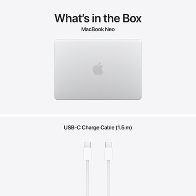 STRÖMADAPTRAR – OBS! MacBookNeo levereras med en usb-c-laddningskabel, men utan strömadapter. För att ladda datorn krävs en usb-c-strömadapter eller annan usbPD-strömkälla med en uteffekt på minst 20W. För optimal laddning av den här Mac-modellen rekommenderas Apples usb-c-strömadapter på 20W.