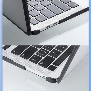 Förbättrad ventilation: Fodralets design inkluderar förhöjda fötter och ventilationsöppningar i botten, vilket säkerställer att din MacBook Pro får tillräcklig luftcirkulation. Detta hjälper till att förhindra överhettning under långa arbetspass eller intensiva uppgifter. De förhöjda fötterna bidrar också till en mer ergonomisk skrivupplevelse genom att vinkla tangentbordet något.