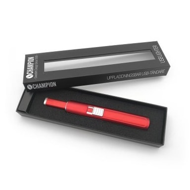 Champion CHET110 – uppladdningsbara tändare använder elektricitet istället för gas och laddas via USB för att alltid vara redo när du behöver den. För att tända drar du säkerhetsspärren framåt så att tändarens ledande elektroder blir synliga. Tryck på knappen som blivit synlig under spärren, då hoppar elektricitet mellan elektroderna så att en elektrisk båge bildas. I bågen alstras hög värme, och genom att rikta tändarens spets mot exempelvis ett stearinljus eller en brasa.