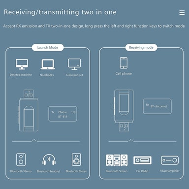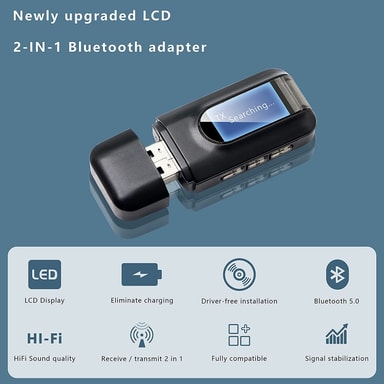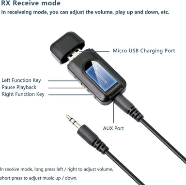 Sändare och mottagare: Den universella Bluetooth 5.0-ljudadaptern gör det möjligt för teven och andra icke-Bluetooth-enheter att strömma ljud till trådlösa hörlurar via Bluetooth. Omvänt blir det möjligt att exempelvis stereoanläggningen tar emot musik trådlöst från mobil och surfplatta.