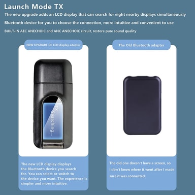 Tydlig LCD-skärm: Displayen gör det enkelt att visa om produkten är i TX-läge eller RX-läge, och det är bekvämt att välja Bluetooth-enheter att ansluta.