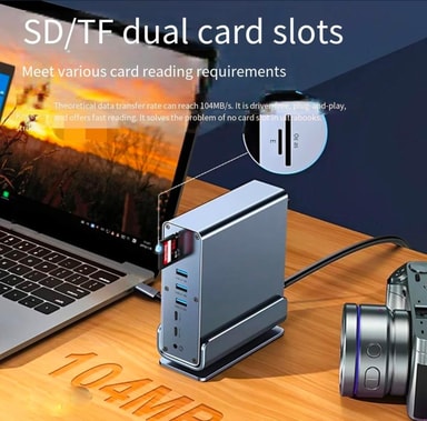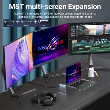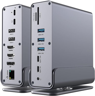 Denna 15-i-1 USB-C dockningsstation med roterbar bas är en kraftfull allt-i-ett-lösning för dig som vill ansluta flera skärmar och tillbehör till din bärbara dator via en enda USB-C-kabel. Med stöd för upp till tre 4K-skärmar, snabb dataöverföring, gigabit-nätverk och 100W PD-laddning passar den lika bra för arbete, gaming och hemmakontor. Den robusta aluminiumdesignen ger effektiv värmeavledning och en stilren look.