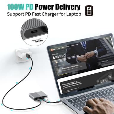 NÖRDIC 1 till 4 USB-C Dockningsstation är en kompakt och mångsidig hubb som kombinerar dual video output, hög dataöverföringshastighet och snabb laptop-laddning i en elegant aluminiumdesign. Med HDMI 4K@60Hz, DisplayPort 4K@60Hz, USB 3.0 och 100W PD-laddning kan du skapa en produktiv arbetsstation på språng.