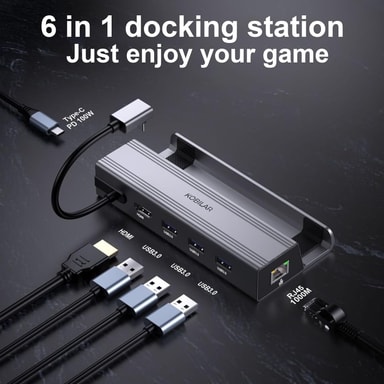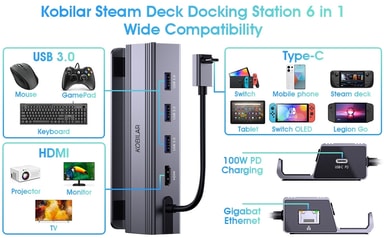 NÖRDIC Steam Deck dockningsstation har 1xHDMI 2.0 (4K60Hz), 1xUSB-C PD 100W, 3xUSB-A 3.0 och 1xRJ45 Gigabit Ethernet. Kompatibel med Steam Deck, ROG Ally, Legion GO, Switch, smartphone och laptop.