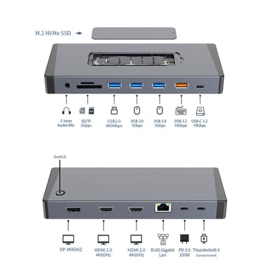 NÖRDIC USB-C 1 till 15 Dockningsstation med Thunderbolt 4 är den ultimata lösningen för proffs och kreatörer som vill maximera sin laptops anslutningsmöjligheter. Den stödjer trippla 4K-skärmar, 100W Power Delivery, inbyggd M.2 NVMe SSD-plats och ultrasnabb dataöverföring, allt i ett robust aluminiumhölje. Perfekt för arbete, kreativt skapande och avancerade arbetsflöden.