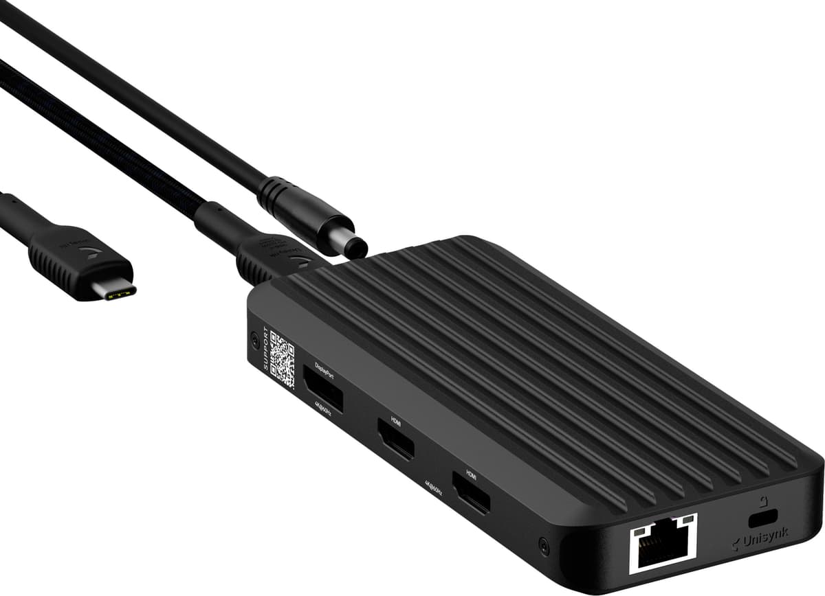 Unisynk 10-ports USB-C dockningsstation erbjuder sömlös anslutning med stöd för 4K@120Hz/8K@30Hz, 100W effekt, trippel skärmutökning och effektiv värmehantering med räfflat aluminium, perfekt för professionella arbetsplatser.Läs mer om produkten