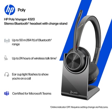 Tack vare HP Poly Voyager 4320 MS Teams headset USB-A-kabel med laddningsstativ hörs du klart och tydligt. Headsetet har en mikrofon med Acoustic Fence-teknik, Bluetooth- och USB-adapteranslutning och långvarig batteritid.Läs mer om produkten