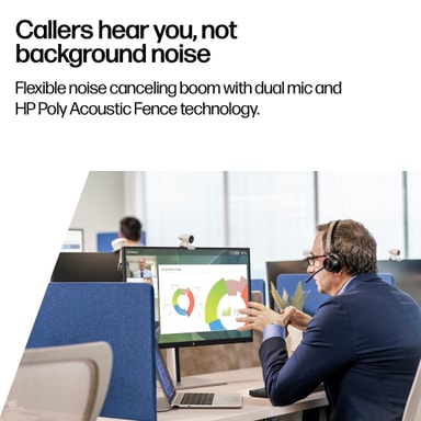 Hör dina kollegor klart och tydligt tack vare de stora 32 mm högtalarelementen som ger ett kraftfullt ljud. Mikrofonen ser till att du hörs utan distraktioner tack vare Acoustic Fence-tekniken, som reducerar bakgrundsljud och samtal.