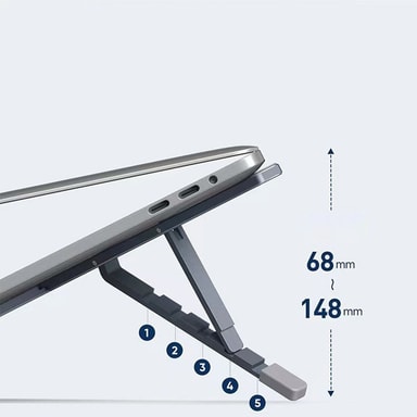 Ergonomisk komfort: Höj din laptop till en ergonomisk betraktningshöjd med detta justerbara laptopställ i aluminium. Med fem justerbara höjdnivåer hjälper det till att lindra spänningar i nacke och rygg, vilket främjar en bekvämare och mer produktiv arbetsmiljö. Perfekt för långa användningstimmar, detta ställ säkerställer optimal hållning och minskar risken för obehag i samband med långvarig användning av bärbara datorer. Kompatibel med olika laptopmärken, det är en mångsidig lösning för att förbättra ergonomin på din arbetsplats.