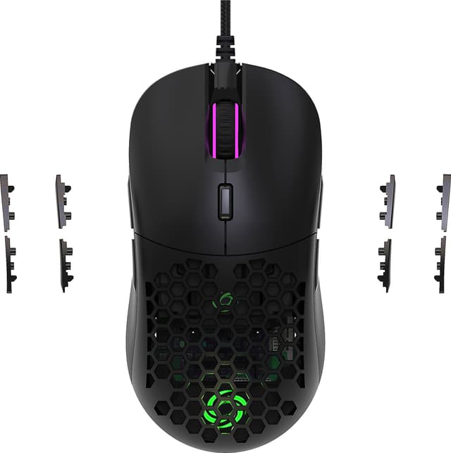 Denna mus kan anpassas för just dig. Du kan välja mellan ett fulltäckande och ett skal med bikakemönster. Använd magneter för att lägga till eller ta bort 4 programerbara knappar på vadera sidan av musen. Musen passar både höver och vänsterhänta spelare. Låg vikt på endast 71 gram