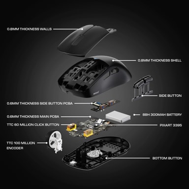 Designad för maratongaming väger denna mus endast 52 gram, vilket minimerar belastningen och maximerar komforten under långvarig användning. Den ergonomiska ambidextra designen erbjuder enkel hantering för både vänster- och högerhänta. De högkvalitativa TTC Golden Dusk Proof-switcharna för vänster- och högerklick har en livslängd på 60 miljoner klick och en TTC-encoder med 100 miljoner steg.