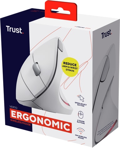 Slappna av i handleden med Trust Verto trådlös vertikal mus. Designen förhindrar karpaltunnelsyndrom, medan de 6 knapparna och den trådlösa anslutningen ger mångsidig användning. Sätt i två AAA-batterier så får du en pålitlig mus med stabil anslutning i upp till sex månader.