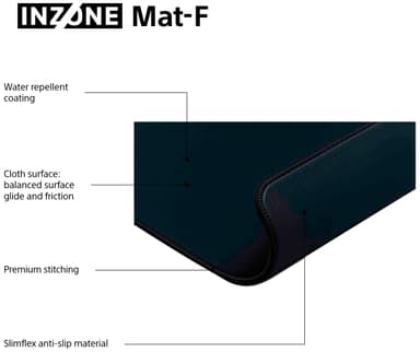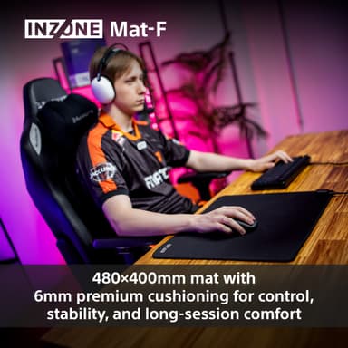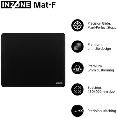 Sony INZONE Mat-F L-musmatta, utvecklad med Fnatic, har en storlek med SlimFlex-bas för dämpning. Dess texturerade yta ger balanserad glidförmåga och distinkt stoppkraft. Utrustad med halkfri undersida och slitstark kantsöm.'Läs mer om produkten