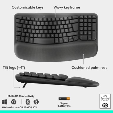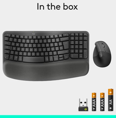 Logitech Wave Keys & Lift tangentbords- och muspaket är ett produktivitetsinriktat paket utformat för att förbättra komfort och ergonomi vid skrivbordet. Det kombinerar det ergonomiska Wave Keys-tangentbordet med den ergonomiska vertikala Lift-musen.Läs mer om produkten