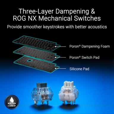 Tangentbordet levereras med linjära mekaniska ROG NX Snow-switchar som har försmords för bästa prestanda. Du kan också byta ut dem direkt mot en annan typ för att bäst passa dina spel. De är inbäddade i ett justerbart packningsfäste och på tre lager av ljuddämpning så att du helt kan anpassa din spelutrustning.