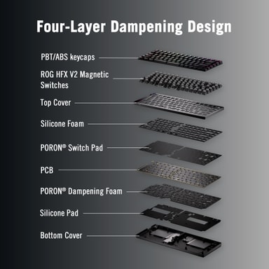De utbytbara ROG HFX V2 magnetiska switcharna erbjuder ultraprecisa tangenttryck med anpassningsbar aktueringspunkt från 0,1-3,5 mm och 0,01 mm stegvis justering, vilket ger förfinad respons och spelkontroll.