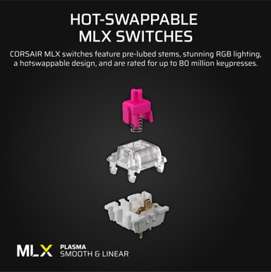 Detta tangentbord har MLX Plasma-switchar med smorda stammar och Fresnel-linsning för bättre RGB-belysning och är försmorda för att minska glapp och ge en mjuk känsla direkt ur förpackningen. Tack vare hot-swap-stöd på kretskortet kan du enkelt byta mellan antingen 3-stifts eller 5-stifts MX mekaniska switchar, som har en imponerande livslängd på 80 miljoner knapptryckningar.