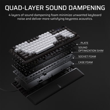 Tangentbordet har en 96% formfaktor som inkluderar numerisk knappsats, vilket ger en bra balans mellan funktionalitet och utrymmeseffektivitet. Det har också ett fyrlagers ljuddämpningssystem med silikonskum och andra material som absorberar oönskat ljud, vilket resulterar i ett djupare, mer tillfredsställande "thocky" ljud från knapptryckningarna. Tangentbordet levereras med hållbara double-shot PBT-tangenter som står emot slitage, glans och blekning.