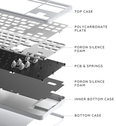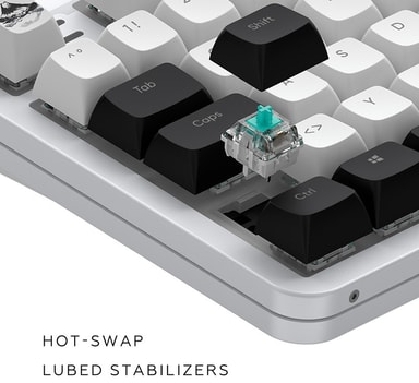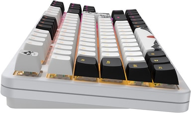Tangentbordet har en metallskelettstomme som ger strukturell integritet, medan flytande tangenter och keycaps i CSA-profil förbättrar både estetik och ergonomi. Den gasket-monterade konstruktionen, förstärkt med dubbelskikts PORON-skum, säkerställer en tystare och mer dämpad skrivupplevelse. ABS-keycaps med Double-Shot-formning ger skarp RGB-belysning och långvariga legends, vilket gör designen både funktionell och visuellt förfinad.
