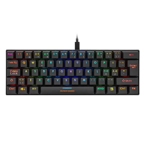 Deltaco gaming mini mekaniskt tangentbord, 60% pan-nordisk layout, rgb, röda brytare, svart deltaco gaming presenterar sitt minsta mekaniska tangentbord i sortimentet. Detta tangentbord kommer med röda rgb-brytare, nordisk iso layout men med en 60% design d.v.s endast 62st tangenter. Mellanslags tangenten använder sig inte av en bygel utan trycks ner helt rakt oavsett om du trycker i mitten eller på sidan av tangenten. Tangenbordet har totalt 19st lyslägen (mjukvarans lägen ej inräknade). Dom flesta lägenas färg kan ändras med (fn + .). Du kan också ändra hastighet eller ljusintensitet för dom olika lägena. När en hastighets- eller intensitetsläge nått lägsta/högsta läge svarar tangentbordet genom att blinka med caps lock och windows tangenten. Mjukvaran till tangentbordet finner du på följande sida: https://www.deltaco.se/sites/cdn/driverslibrary/gam-075/gam-075.zip • antal tangenter: 62 • nordisk iso layout 60% • röda rgb-brytare • rgb med mjukvara • n-key rollover • 45g ±10g aktiveringskraft • double injection keycaps • 1,5m usb micro-b - usb-a kabel • livslängd på 50 miljoner tangenttryckningar • dimensioner: 290x100x30mm-42mm • vikt: ca 600 g förpackningsinnehåll: gam-075, 1,5m usb-microb - usb-a kabel och manual.