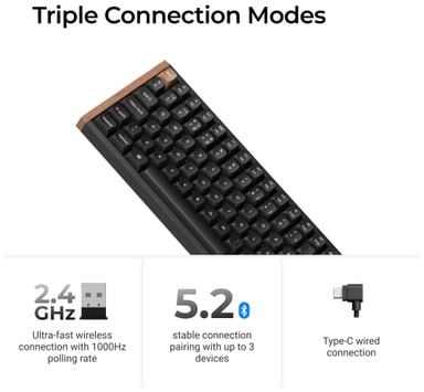 Anslut sömlöst till tre enheter via Bluetooth 5.2 eller upplev ultralåg latens med den trådlösa 2,4 GHz-dongeln och upp till 1000 Hz polling rate. Det erbjuder även en USB-A till USB-C-anslutning för ökad flexibilitet.