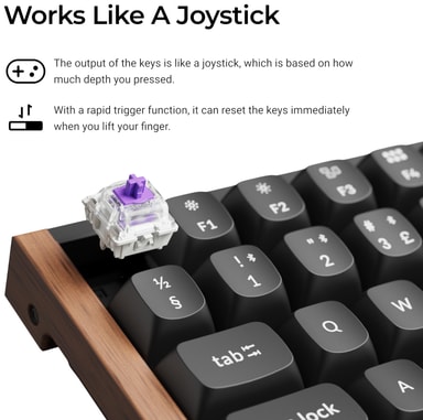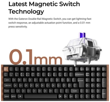 Detta tangentbord har möjlighet till hot-swap-switchar för att passa dina skrivpreferenser. De försmorda Gateron 2.0 Purple-switcharna har en dubbelskensdesign som erbjuder bättre hållbarhet, precision och mjukare funktion. Detta tangentbord har en justerbar aktiveringspunktsfunktion som sträcker sig från 0,2 till 3,8 mm med 0,1 mm känslighet, vilket gör det möjligt för användaren att ändra det avstånd tangenten behöver tryckas ner innan den registreras för förbättrad precision, minskad belastning och en mer personlig skrivupplevelse.