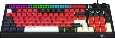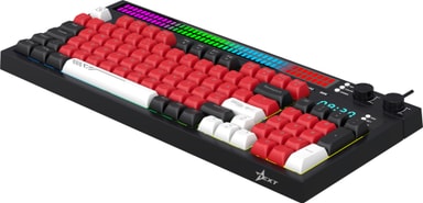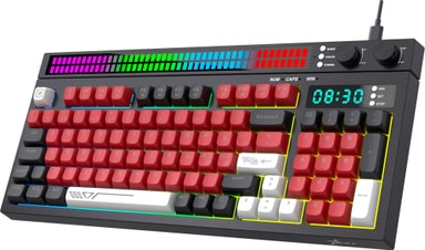 Next KD5 tangentbord har en formfaktor på 94 %, dubbla kontrollknappar för volym och ljusstyrka, ett inbyggt larm med nedräkning, anpassningsbar RGB-belysning och en ljudresponsiv ljuslist med 17 dynamiska nyanser och över 13 ljusmönster.