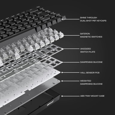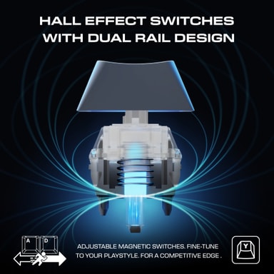Få exakt återkoppling och snabbare responstid med Gateron justerbara magnetiska switchar som har snabbutlösningsläge som omedelbart återställer tangenterna för reducerad uppåtrörelse så att du får en snabbare inmatning. Du kan också anpassa tangenttrycken från känsliga till hårda beroende på dina favoritspel, med hjälp av aktiveringspunktsfunktionen.