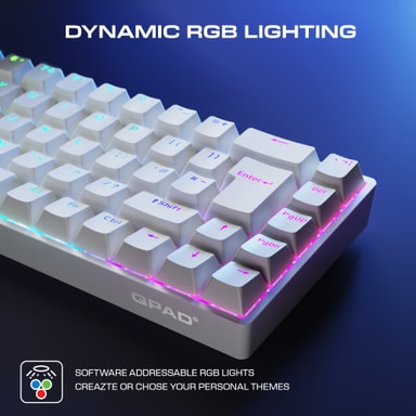 Ta ditt spelande till nästa nivå med QPAD Flux 65 Gaming-tangentbord med snabbutlösningsläge för snabbare responstid, Double shot PBT-tangenter för långvarig hållbarhet, ljuddämpare i silikon för tysta tangenttryckningar och en kompakt formfaktor.