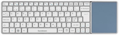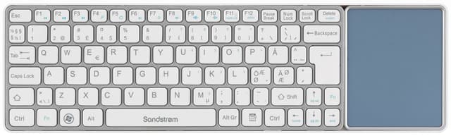 Elegant trådlöst tangentbord från Sandstrøm med USB-receiver. Den integrerade pekplattan är ett bra substitut för en datormus om du har ont om plats, exempelvis när du reser. Funktionstangenterna kan även användas som multimedia-tangenter så att du får snabb kontroll över exempelvis volymen. Tangentbordet körs på 2 AAA-batterier.