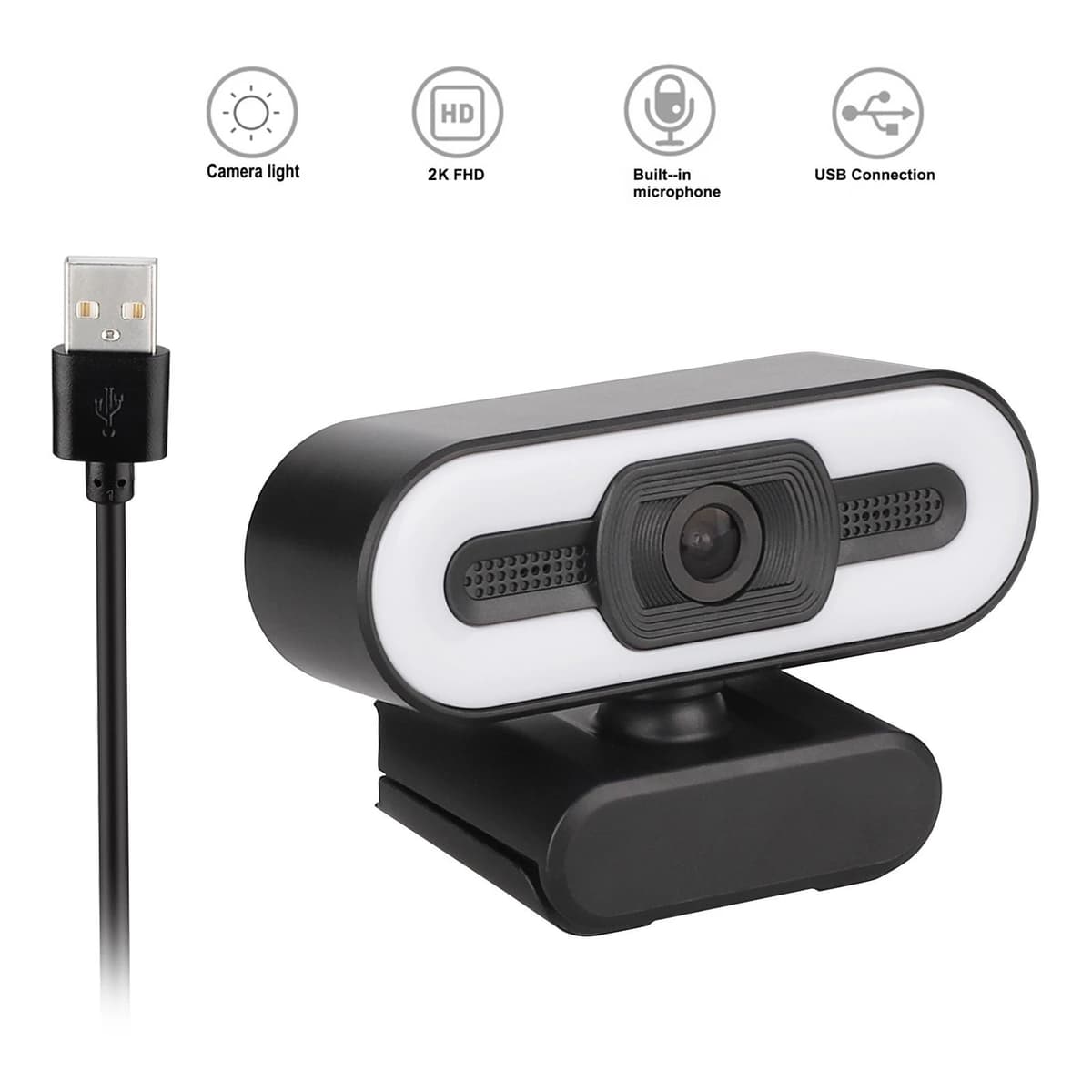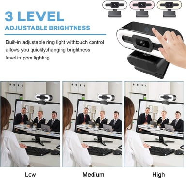 NÖRDIC 2K HD-webbkameran har en maximal upplösning på 2560X1440 vid 30 fps. Funktionen autofokus ger klara och tydliga detaljer. speciellt utformad för professionell videokonferens när du arbetar hemma. Kameran har stöd för Skype, Zoom, Teams, Facetime, Google hangouts, Twitch, YouTube-inspelningar med flera. Inbyggd Ring Light LED för att kunna justera ljuset i tre nivåer med fingertouch och hitta den bästa ljuset för ditt behov.Den inbyggda brusreducerande mikrofonen minskar ljudet från omgivningen för att förbättra ljudkvaliteten på din video. 360-graders roterande webbkameraobjektiv gör det enkelt att filma från alla vinklar. Med ett justerbart stativkläm kan du placera den stabilt och säkert på en bärbar dator eller externt skärm. Lätt att installera. Du kan enkelt ansluta webbkamera till PC, MacBook, Notebook och Smart TV utan ytterligare drivrutiner. Kompatibel med mest populära system som Microsoft Windows 7/8/10 och XBOX, Apple Mac OS, Google Chrome OS och Android-system, Linux och Smart TV.