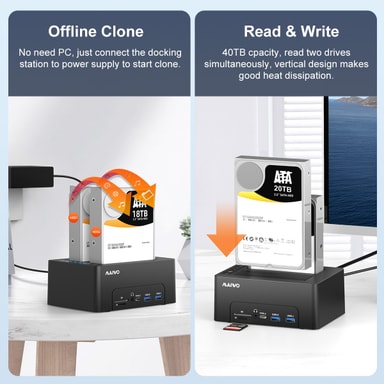 Maiwo USB3.1 Dockningsstation kombinerar snabb hårddiskkloning med mångsidig anslutning. Den stöder både 2,5" och 3,5" SATA HDD/SSD och kan användas som en offline-klon eller extern docka. Med integrerade anslutningar som HDMI, USB, LAN och kortläsare är detta en ultimat lösning för datahantering och arbetsstationer.Specifikationer: