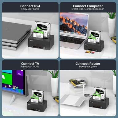 MAIWO K3082CR USB 3.1 SATA HDD Dockningsstation låter dig ansluta två 2,5 ""eller 3,5"" SATA-hårddisk till din dator via USB-port. Det är en kraftfull produkt för dataöverföring, säkerhetskopiering och kloning. Med Superspeed USB 3.1 erbjuder det en dataöverföringshastighet upp till 5Gbps. Det är tio gånger snabbare än USB 2.0-hastigheten på 480 Mbits. Kloningsfunktionen möjliggör klona data på ett säkert och optimalt sätt. Led indikatorn visar kloningsprocessen 25%, 50%, 75% och 100%. K3082CR har kortläsare av typ CF/SD och en USB3.1 port som funkar som en hub. Medföljande strömadapter levererar stabil ström för en säkrare HDD funktion.