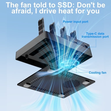 FunktionerExtremt snabb USB4.0-överföring upp till 40 Gbps, perfekt för stora filer och högupplöst videoredigering1-till-3 klonfunktion för att duplicera en SSD till tre mål samtidigt, idealiskt för backup och distributionStöd för upp till fyra M.2 NVMe SSD-enheter samtidigt, flexibelt med olika längder (2230–22110)Inbyggd kylfläkt och värmeavledande design för att hålla SSD-enheterna svala under långvarig användningEnkel installation och borttagning av SSDs utan extra verktygVisar aktivitetsstatus för varje SSD-bay, vilket gör kloning och filhantering snabb och enkel