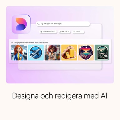 Ge idéerna liv med kraftfulla AI-funktioner1 och verktyg i Microsoft 365. Generera unika designer och redigera foton i Designer. Skapa videor som ett proffs i Clipchamp. Kom över skrivkramp och dela tankarna med självförtroende med Copilot1 vid din sida i Word.