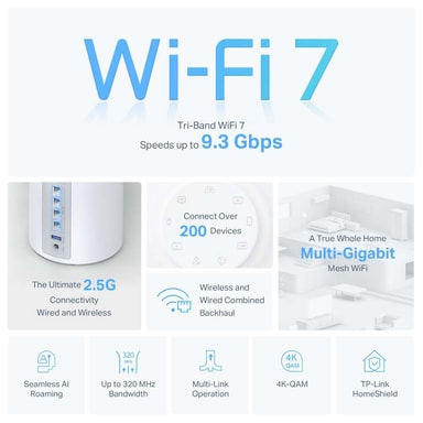 Utrustad med de senaste Wi-Fi 7-funktionerna, inklusive 320 MHz-kanaler, 4K-QAM och 6 GHz-bandet, säkerställer detta system ett nätverk med exceptionell prestanda och tillförlitlighet.