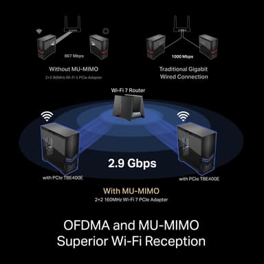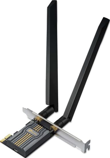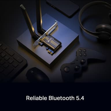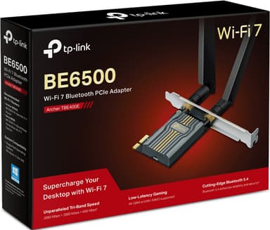 TP-Link TBE400E Wi-Fi 7 PCIe-adaptern levererar 6500 Mbps hastighet över tri-bandfrekvenser med dubbla högförstärkande antenner, MU-MIMO, 4096 QAM och Bluetooth 5.4, vilket säkerställer sömlös anslutning och förbättrad säkerhet med WPA3.Läs mer om produkten
