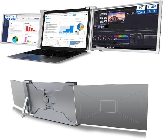 Skärmarna kan fästas på datorer mellan 15 till 17,3 tum och det finns ett teleskopstativ på baksidan av skärmarna som låter dig justera vinkeln och ökar stabiliteten. Det går att vrida den högra skärmen upp till 180 grader och den vänstra upp till 235 grader och skärmarna kan vikas ihop och förvaras i en medföljande väska för smidig transportering. Skärmarna är kompatibla med Windows, MacOS (M1 Pro och M1 Max, ej M1 och M2 MacBook, Microsoft Surface eller Chromebook), PlayStation, Xbox och mer. Inga drivrutiner krävs, plug and play.