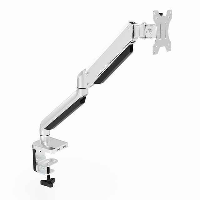 Ett praktiskt skrivbordsfäste för 1 monitor med gasfjäder. Fästet är flexibel och monitorn kan både tiltas och roteras. Den passar skärmar i storlekar 13""-32"". Materialet är aluminium och stål. Fästet kommer med två monteringsalternativ, klämma och hylsa. Färgen är silver.