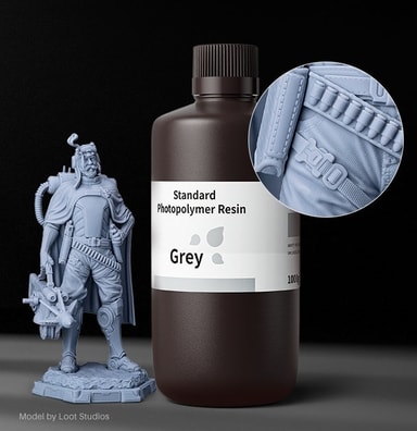 Elegoo Standard Resin til bruk med resin 3D-printer. Dette resinet er unviersalt og kan brukes på de fleste printere med 405nm bølgelenge på UV-lyset. Resinet har lite lukt, høy presisjon og krymper lite.