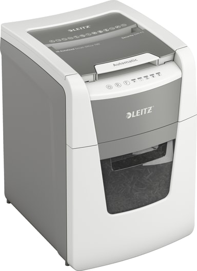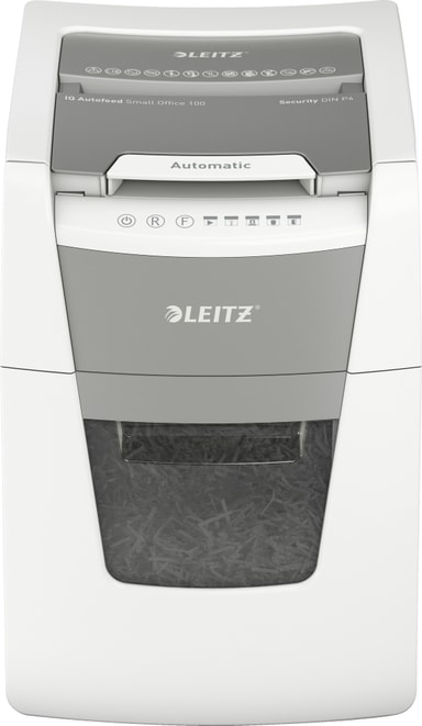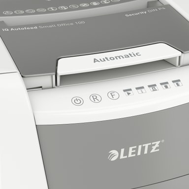 Tysta, effektiva Leitz IQ AutoFeed Office 100 P4 dokumentförstörare matar sig själv med upp till 100 pappersark automatiskt på en gång. I manuellt läge kan dokumentförstöraren strimla 8 ark samtidigt.Läs mer om produkten