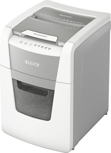 Tysta, effektiva Leitz IQ AutoFeed Office 100 P4 dokumentförstörare matar sig själv med upp till 100 pappersark automatiskt på en gång. I manuellt läge kan dokumentförstöraren strimla 8 ark samtidigt, och allt som kommer in går ned i en 34-literskorg som 4 x 28 mm tvärskurna bitar vilket ger dig P-4 DIN-säkerhet. Du behöver inte mata in papper manuellt eller ta bort häftklamrar och gem först, denna automatiska pappersförstöraren med smidig touchkontroll gör allt åt dig.
