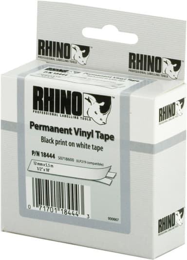 DYMO RhinoPRO märktejp perm vinyl 12mm, svart på vitt, 5.5m rulle (18444)