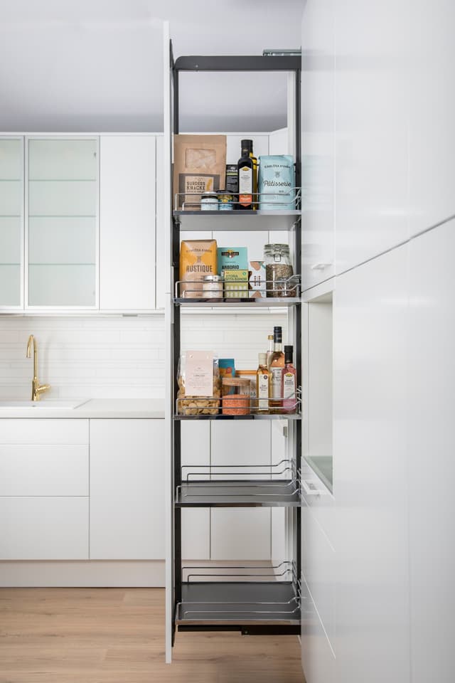 Dispensa högskåpsutdrag för 40 cm skafferi/skåp. Genomskinlig och kompakt. Inte en enda kvadratcentimeter bortkastad!