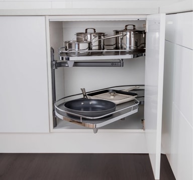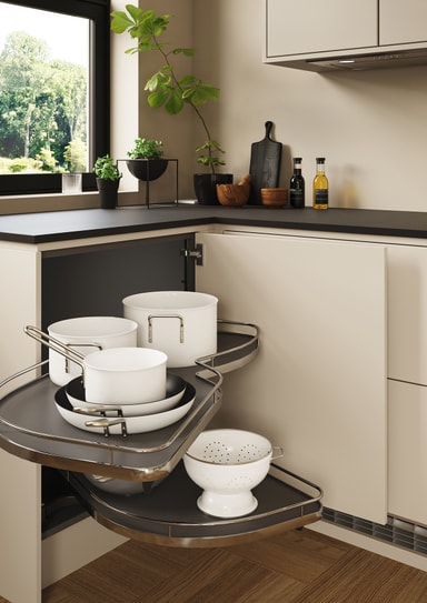 LeMans hyllor svängs ut i skåpets front. Du kan förvara många kastruller och stekpannor på varje hylla och innehållet är alltid lättillgängligt. Hyllorna rör sig oberoende av varandra och är fullt funktionella med 85° dörröppning. Flexibla lösningar gör att handtagen inte kolliderar. Den kontrollerade och flytande rörelsen är en sömlös kombination av rotation och svängning. Hyllorna rör sig oberoende av varandra och gör skåpets innehåll mer lättillgängligt.