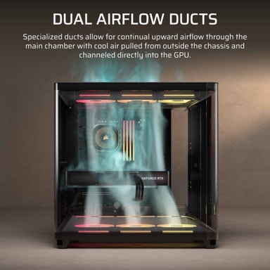 Corsair AIR 5400 LX-R RGB Triple Chamber PC-chassi är designat för kraftfull kylning och en prydlig installation. Dess trekammarlayout separerar CPU-, GPU- och nätaggregatsområdena för att hålla värmen under kontroll, medan ett dedikerat utrymme stödjer en 360 mm element. Det inkluderar även tre LX120-R iCUE LINK RGB-fläktar som levererar starkt luftflöde med iögonfallande belysning.