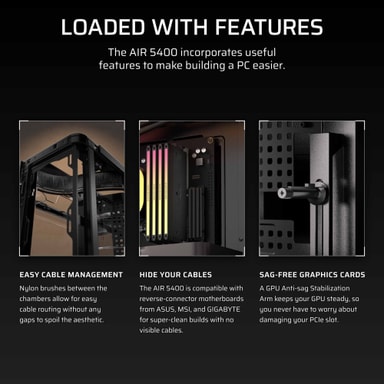 AIR 5400 LX-R är byggd för effektiv kylning med sin trekammardesign som håller värme från olika komponenter separerad. Ett dedikerat utrymme för en 360 mm element och smarta luftflödeskanaler hjälper till att upprätthålla stabila temperaturer, medan de tre inkluderade LX120-R iCUE LINK-fläktarna säkerställer starkt och konsekvent luftflöde genom hela chassit.