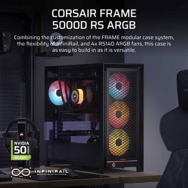 Corsair FRAME 5000D RS ARGB är ett rymligt miditower-chassi för eATX-byggen. Med högt luftflöde, fyra ARGB-fläktar och stöd för 420 mm radiatorer, är det perfekt för kraftfulla system.Läs mer om produkten