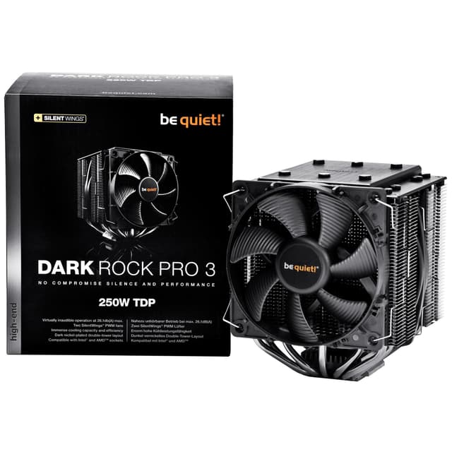 be quiet! Dark Rock 3 Pro kylare är ett bra val för din överklockade speldator som använder Intel eller AMD-processor. Kylaren använder sig av en kylfläns av aluminium, robusta kylkanaler med kopparbeläggning och en massiv nickelpläterad dubbelkylare för snabb värmeavledning. Den frontmonterade 120 mm SilentWings kylfläkten jobbar tillsammans med en 135 mm PWM-fläkt som säkerställer optimalt luftflöde runt processorn. Låg ljudnivå på 26,1 dBa och möjlighet att montera en extra 120 mm fläkt gör denna kylare till en vinnare när det gäller speldatorer.